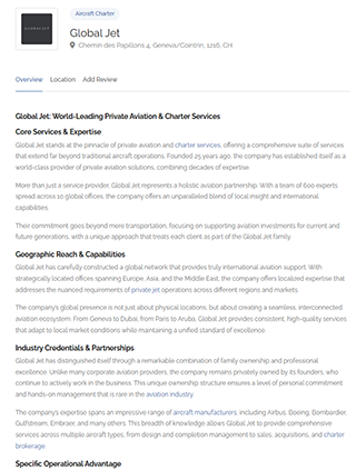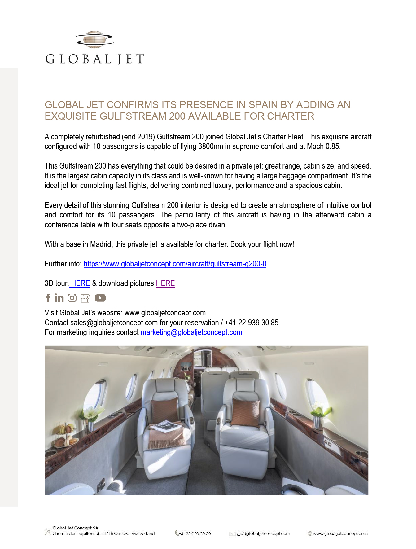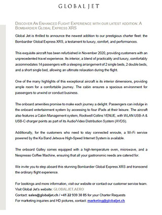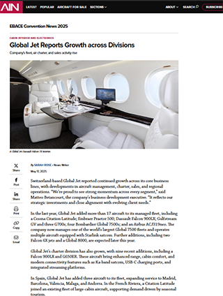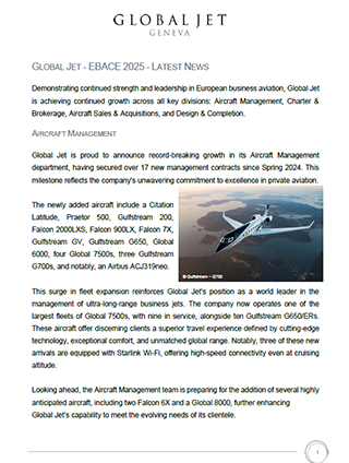 Global Jet is a world leader in private aviation. Founded 25 years ago, the Global Jet family has helped countless generations take to the skies with an unrivaled commitment to excellence. The company is still privately owned by its founders, actively working in the business. If you are thinking about chartering or owning your private aircraft, consider joining the Global Jet family. We are more than service providers; we are partners.