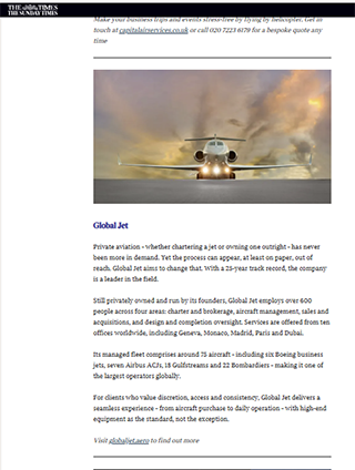 We have a team of around 600 experts spanning 10 offices around the world, all with a unique insight into the world of private aviation and an unwavering eye for safety and details. No matter where you are in the world, a Global Jet specialist will be on hand to offer localized knowledge on everything from chartering and, aircraft management to brokerage and aircraft sales.